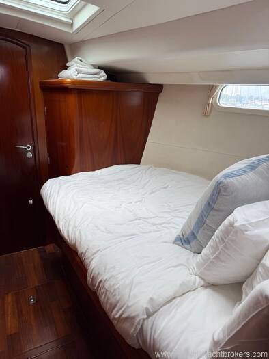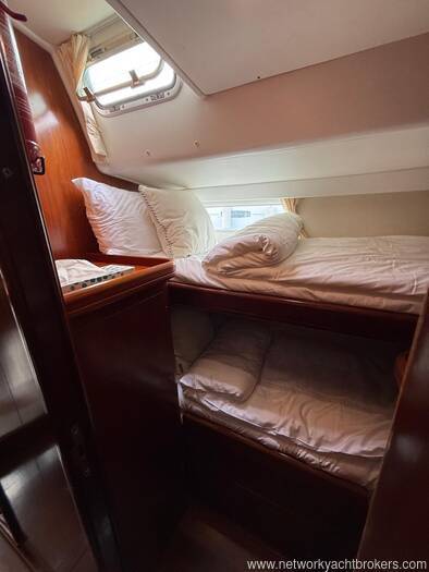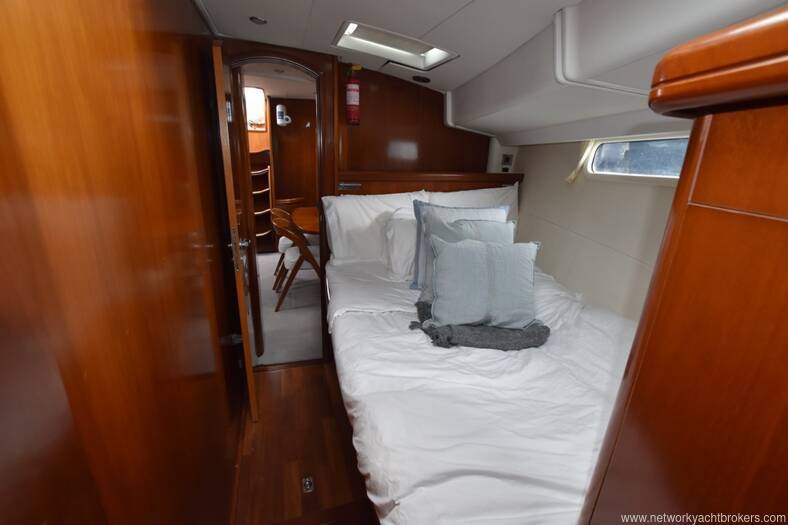 Her interior features the desirable 3-cabin plus crew layout, comprising a spacious owner’s suite aft, two mirrored double guest cabins forward (each with en-suite heads), and an additional day-head at the companionway which also serves the crew cabin in the aft walkthrough.