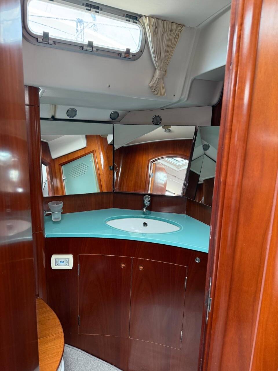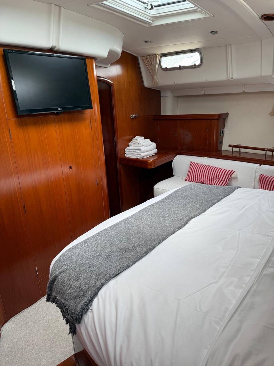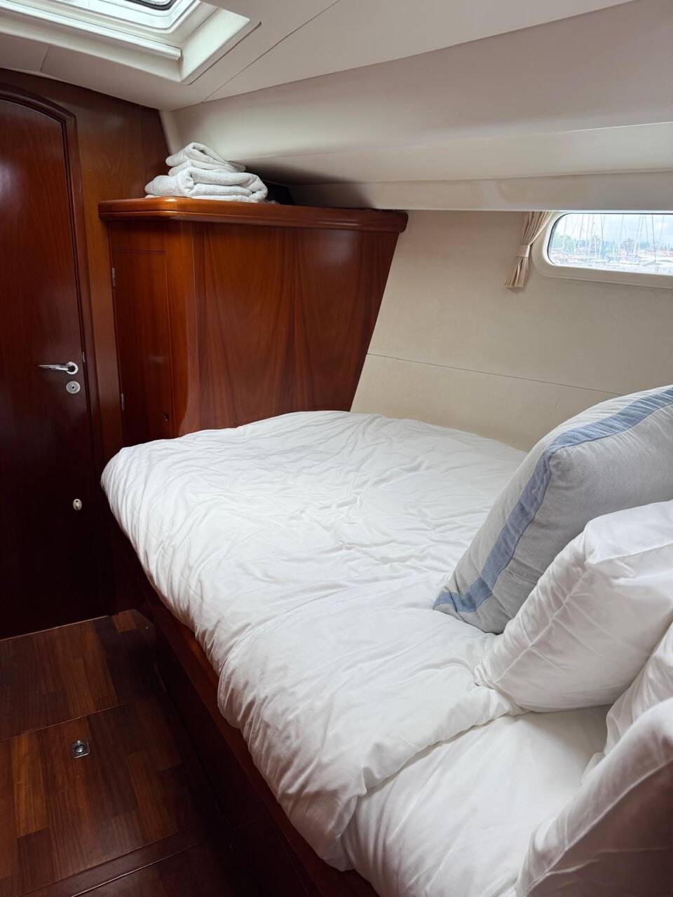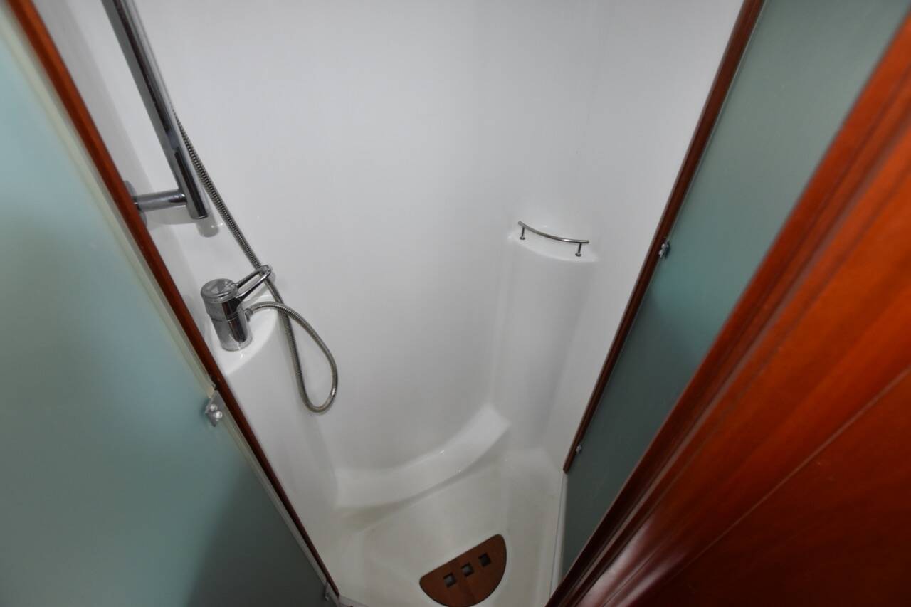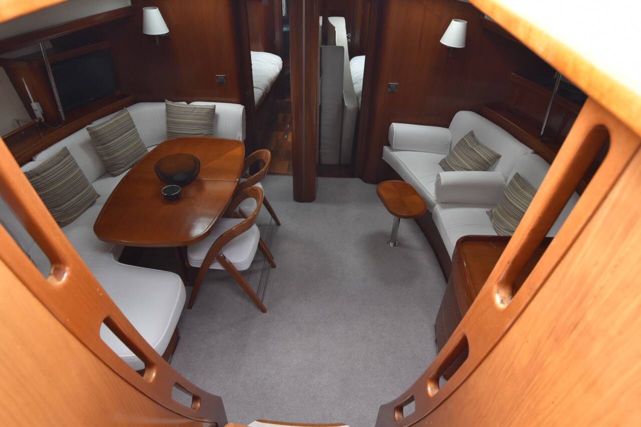 Her interior features the desirable 3-cabin plus crew layout, comprising a spacious owner’s suite aft, two mirrored double guest cabins forward (each with en-suite heads), and an additional day-head at the companionway which also serves the crew cabin in the aft walkthrough.