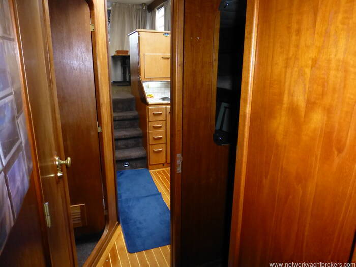Door leading through to passage with bunk berth cabin to port with hanging locker, storage and opening portlight. Opposite to starboard, door to the day heads and door to the twin berth cabin. This cabin has an infill cushion to convert to a double bert and has a hanging locker, storage, opening portlight.