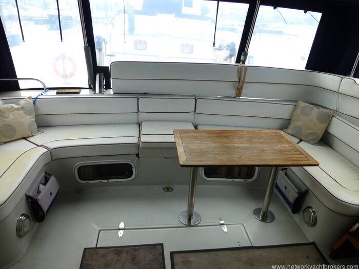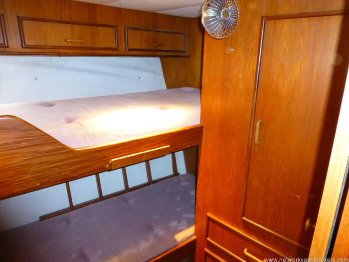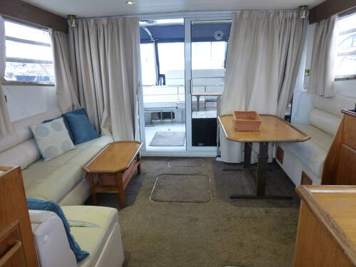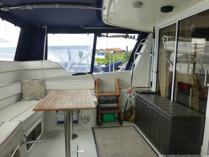Sliding doors to the cockpit with U shaped seating, removable table, ladder access to the flybridge, full cockpit canopy. Under the cockpit seating, a hatch lifts to access the crew cabin with a ladder down to the cabin with twin berths and en-suite heads. Opening portlights to the cockpit. One berth currently used for storage.