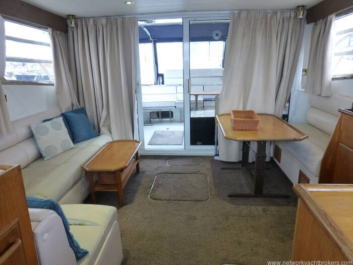 U shaped galley to port, steps up to the helm with a double seat to starboard. Spacious and light saloon with L shaped settee with coffee table. To port, L shaped storage unit with TV and aft to port a double seat with dining table. Both tables can be repositioned.