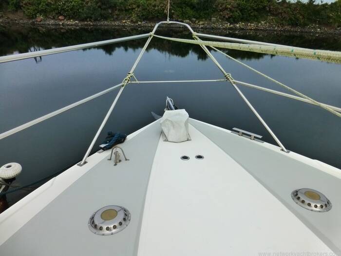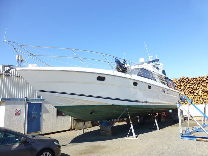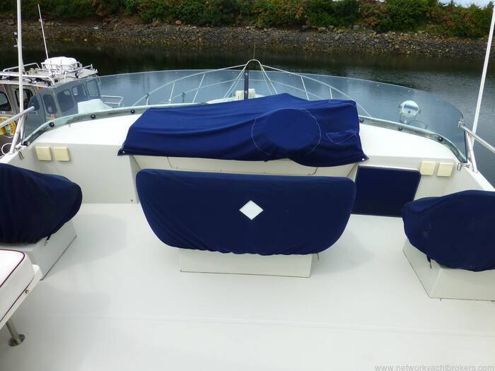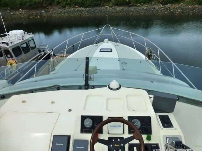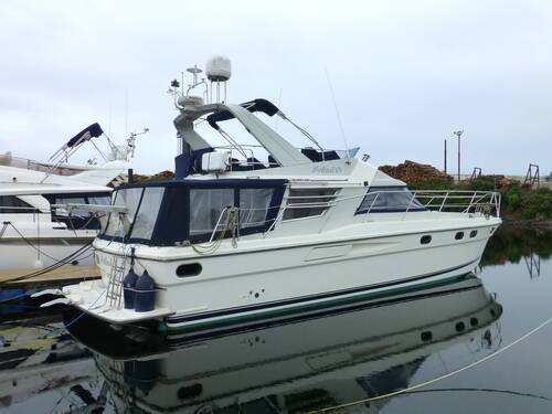 This Fairline 50 is a spacious and comfortable motor boat, well built for coastal or offshore cruising. Great accommodation with a forward owners en-suite cabin, bunk berth and twin berth cabin and aft in the cockpit, a twin berth en suite crew cabin. Large saloon with port and starboard settees, good visibility from the raised helm position. Flybridge with central helm position, seating and bimini. Lightly sailed in last few years and has been well maintained. Powered by twin Volvo Penta 358hp engines, bow and stern thrusters to aid maneuverability. Stainless steel dinghy davits with Zodiac inflatable dinghy and Suzuki 2.5hp outboard.