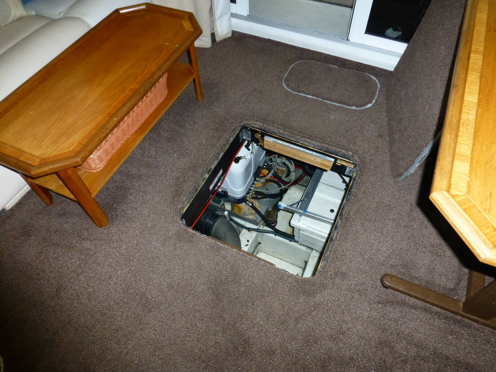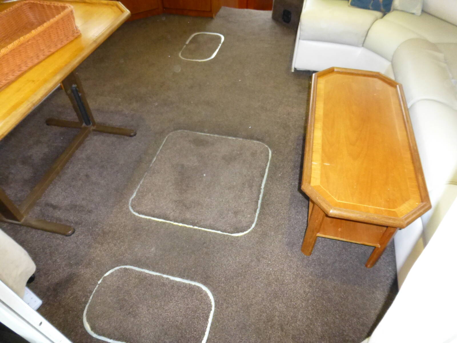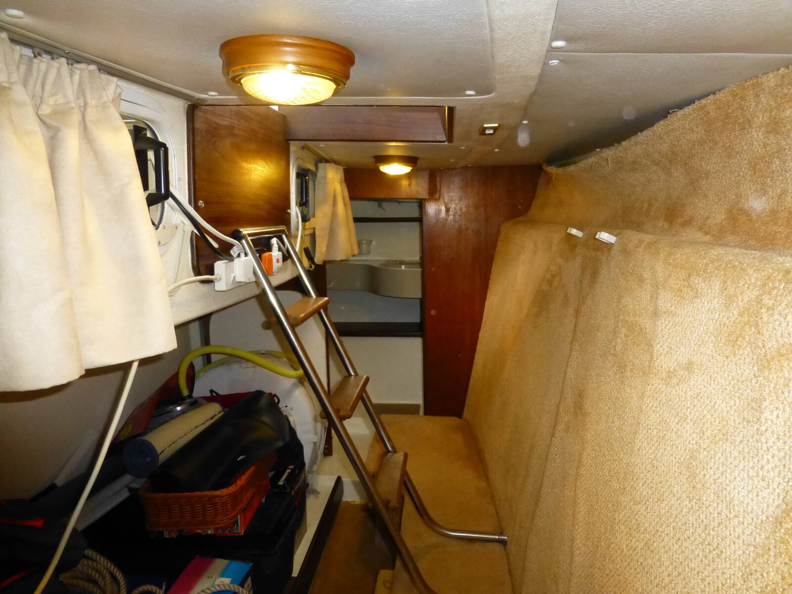 Carpeted, curtains and blinds throughout, windscreen demisters. Saloon floor hatches with access to engine compartment.