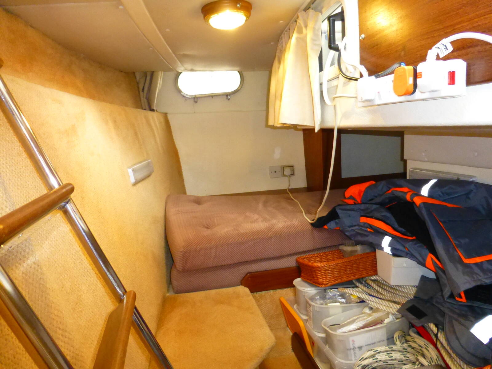 Door leading through to passage with bunk berth cabin to port with hanging locker, storage and opening portlight. Opposite to starboard, door to the day heads and door to the twin berth cabin. This cabin has an infill cushion to convert to a double bert and has a hanging locker, storage, opening portlight.