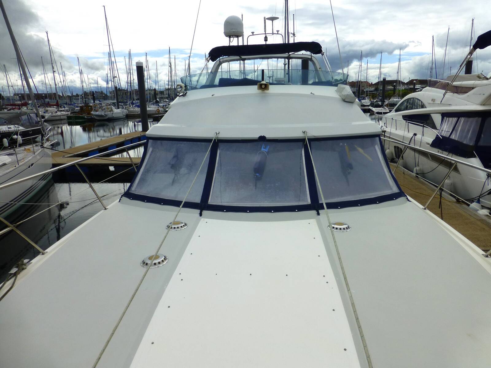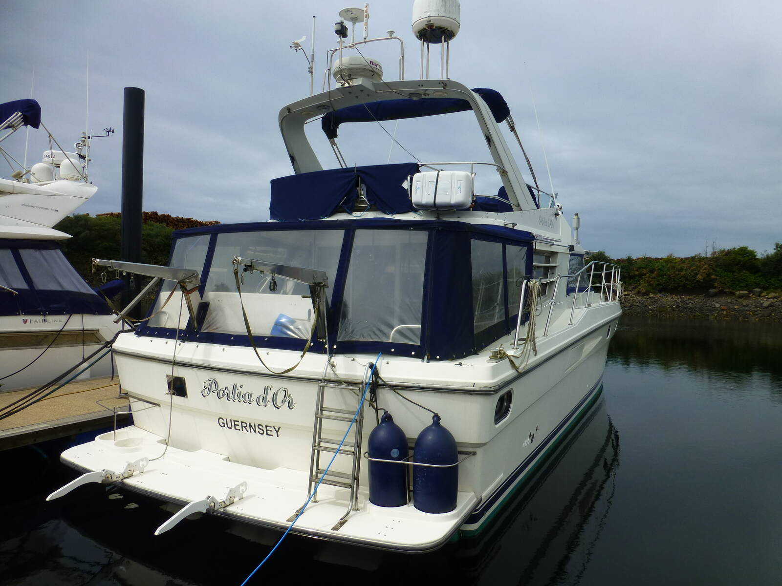 This Fairline 50 is a spacious and comfortable motor boat, well built for coastal or offshore cruising. Great accommodation with a forward owners en-suite cabin, bunk berth and twin berth cabin and aft in the cockpit, a twin berth en suite crew cabin. Large saloon with port and starboard settees, good visibility from the raised helm position. Flybridge with central helm position, seating and bimini. Lightly sailed in last few years and has been well maintained. Powered by twin Volvo Penta 358hp engines, bow and stern thrusters to aid maneuverability. Stainless steel dinghy davits with Zodiac inflatable dinghy and Suzuki 2.5hp outboard.