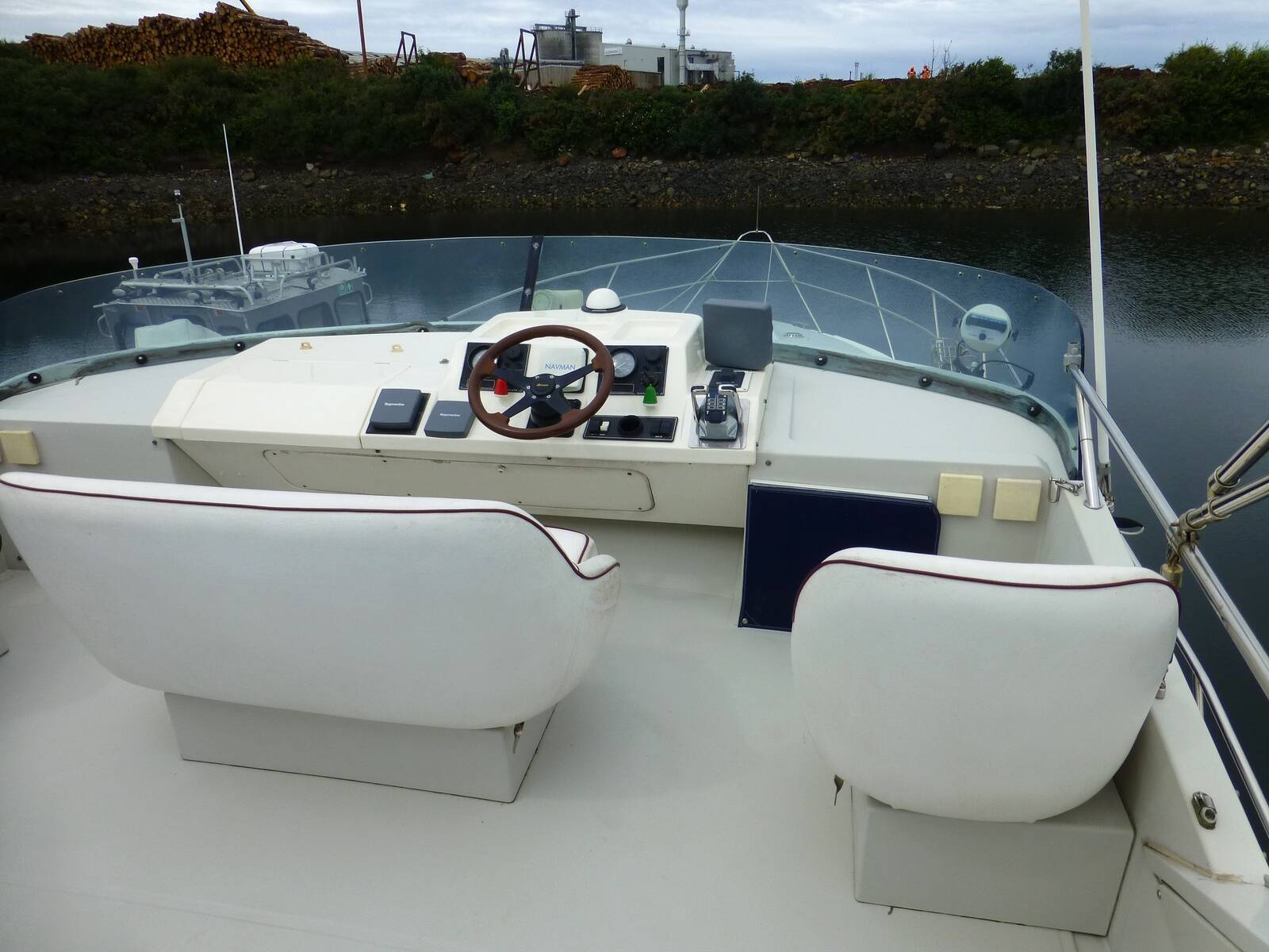 Sliding doors to the cockpit with U shaped seating, removable table, ladder access to the flybridge, full cockpit canopy. Under the cockpit seating, a hatch lifts to access the crew cabin with a ladder down to the cabin with twin berths and en-suite heads. Opening portlights to the cockpit. One berth currently used for storage.