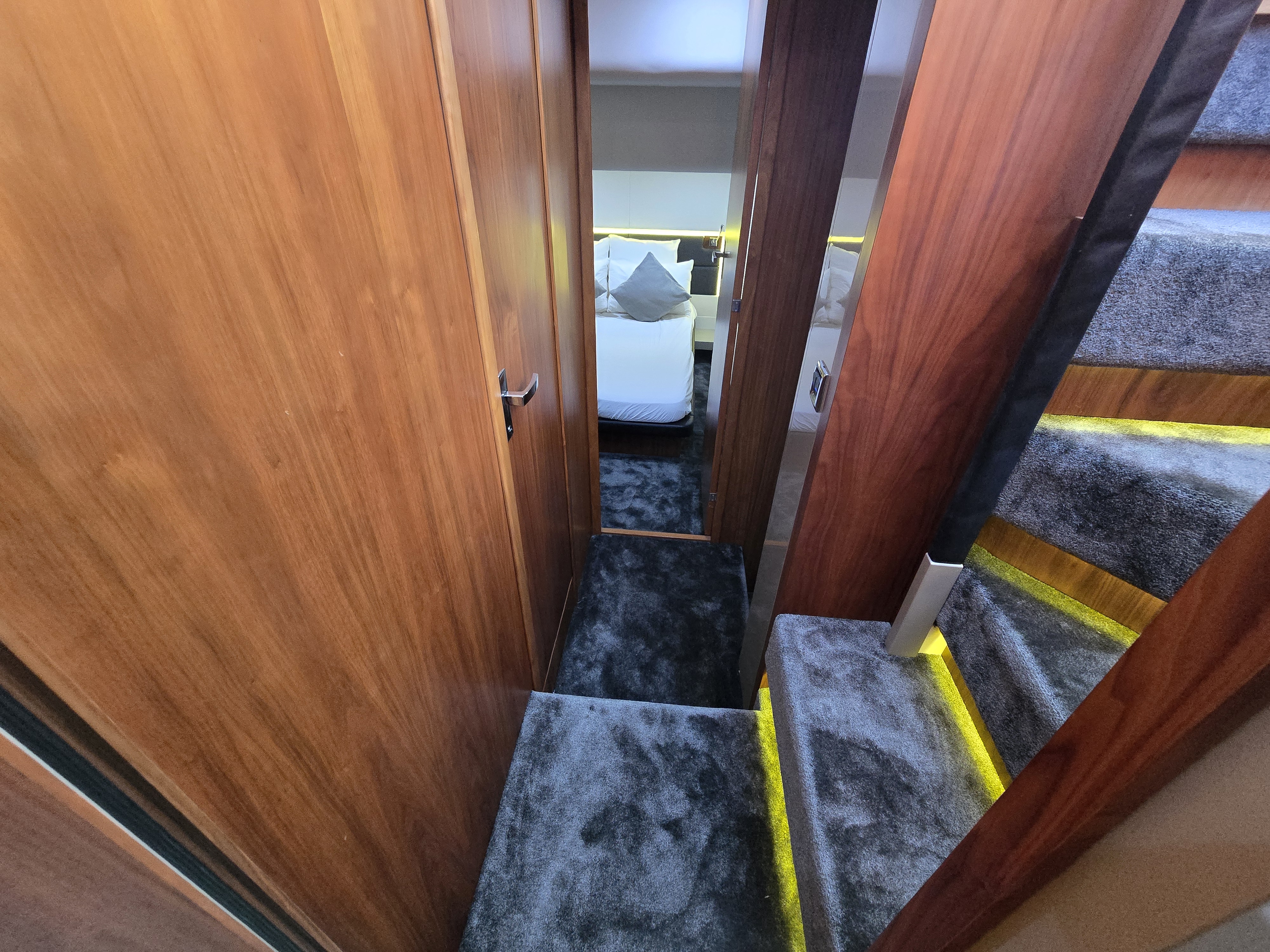 Anphica features 3 luxury cabins for up to 6 guests. The master cabin is forward with a centre king-size bed and en-suite facilities. Two further cabins have twin side-by-side beds with the option of converting into doubles. The starboard guest cabin offers en-suite facilities which can also be accessed from the lobby as a day head. A further single crew cabin or for storage is aft.