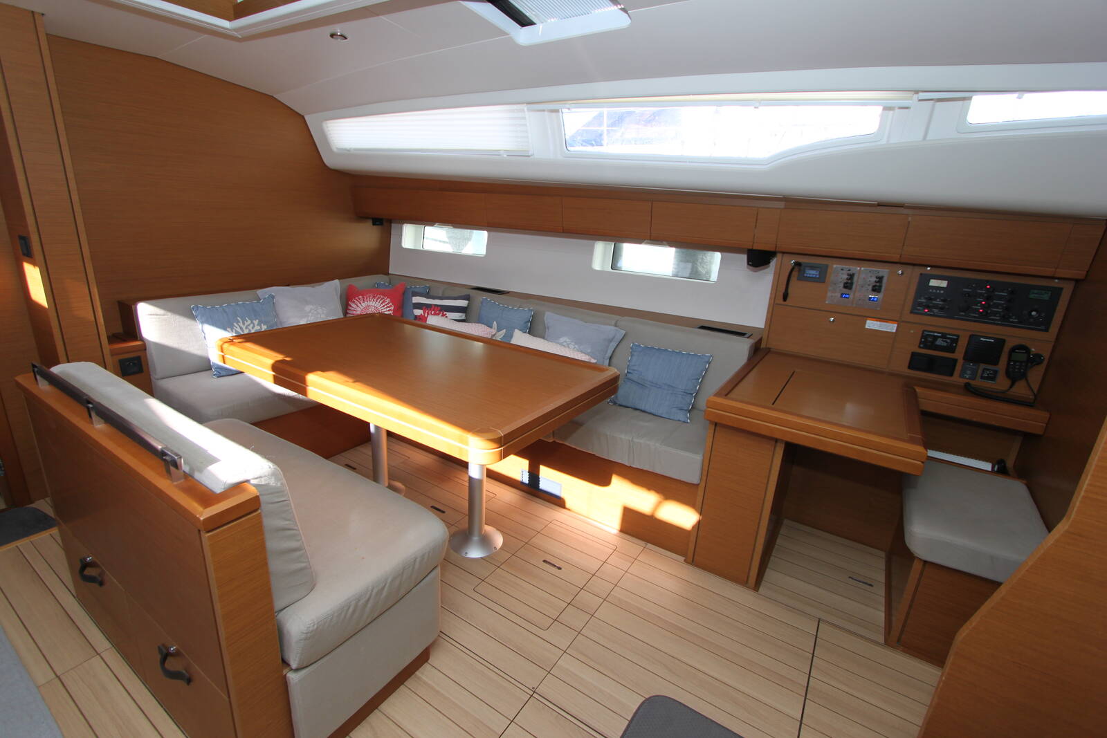 Spacious saloon with panoramic windows, convertible dining area, and elegant finishes.